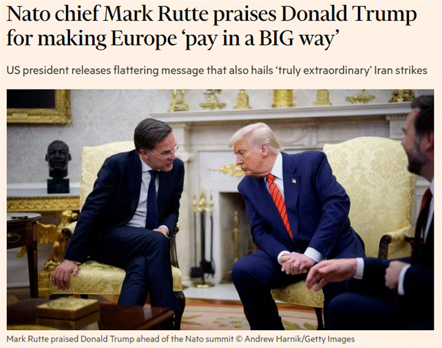 Ebbene a l’Aia tutti i 23 Paesi sui 27 dell’Ue che fanno parte anche della NATO sono corsi a baciare il culo a Trump.